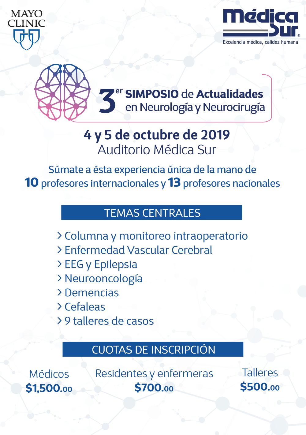 Por tercer año consecutivo, Médica Sur en alianza con Mayo Clinic presentó el simposio “Actualidades en Neurología y Neurocirugía”, los pasados 4 y 5 de octubre. Este evento académico, realizado en el Auditorio Médica Sur, reunió a 24 profesores nacionales e internacionales expertos en Neurología y Neurocirugía y sus diversas ramas para presentar más de 45 conferencias y 10 talleres de casos clínicos.